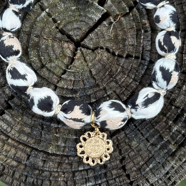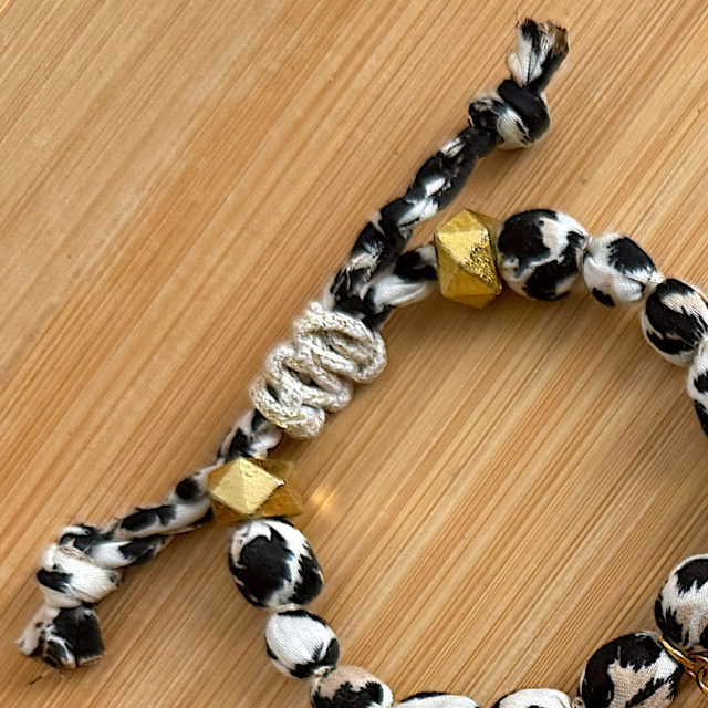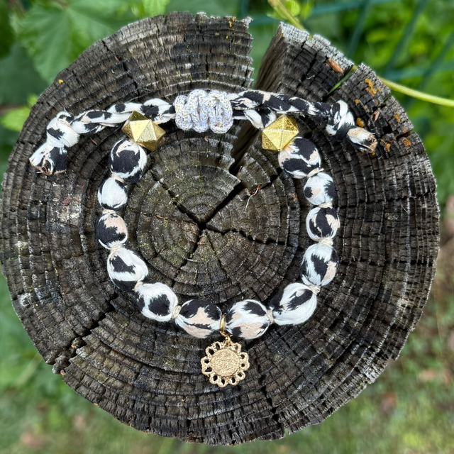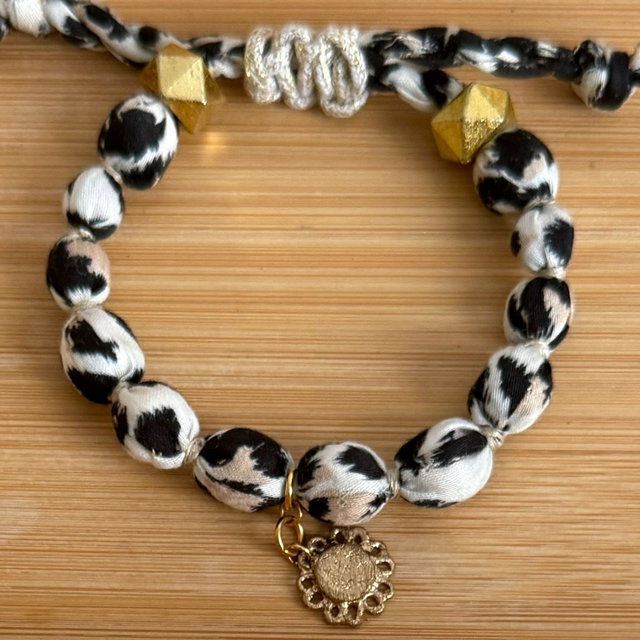 Bracelet d’un diamètre maximum de 8 cm et minimum de 5 cm, en tissu motif panthère ( beige, noir, blanc ), violet. Perles en métal doré.