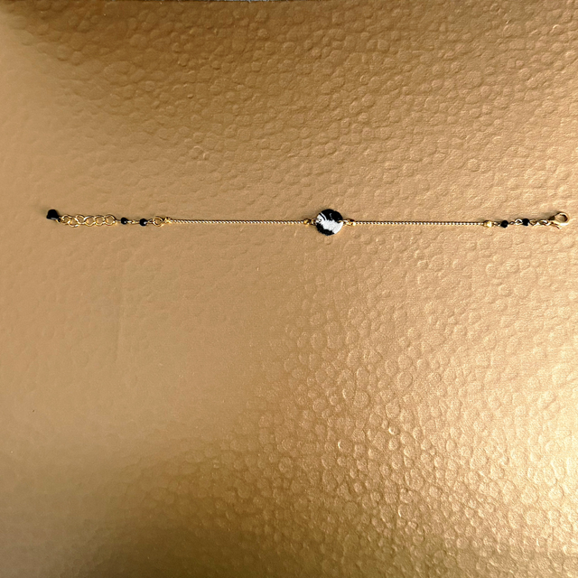 Fermeture mousqueton en laiton doré. Chaînette avec petit pierre fine noire.