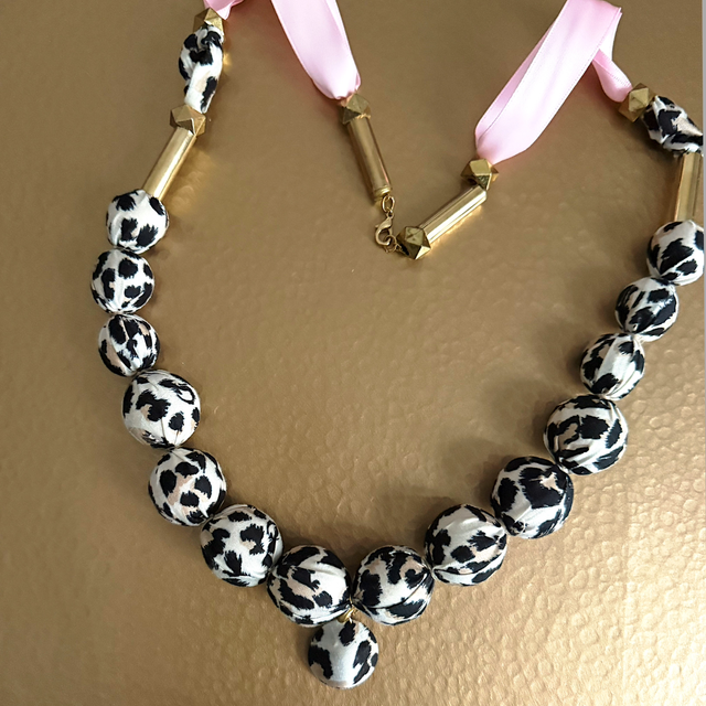 Long collier sautoir de 74 cm de long, en tissu imprimé panthère beige, noir et large ruban de rose.