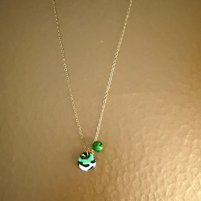 Pendentif médaillon longueur de 1,5 cm en tissu imprimé floral vert, violet et perle de verte en verre.
