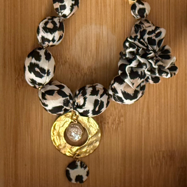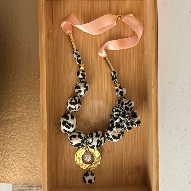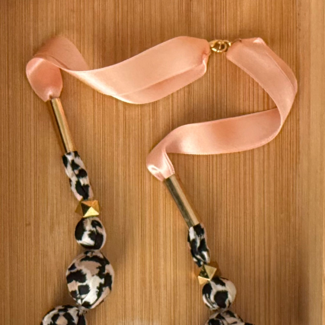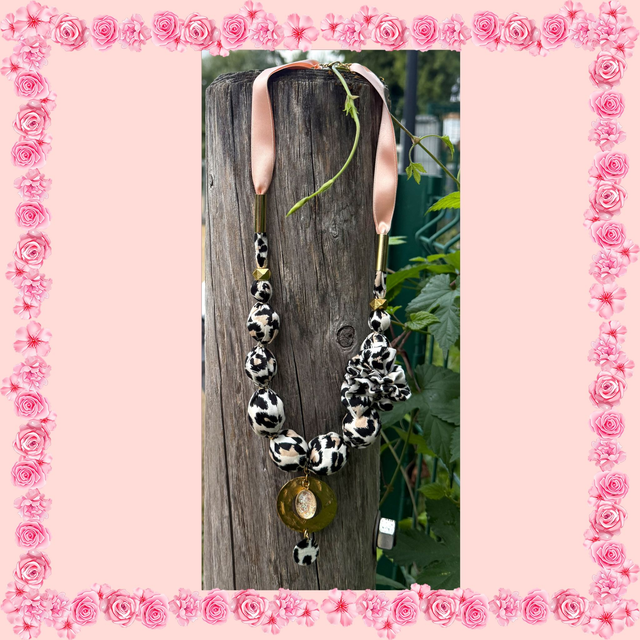 Collier de 64 cm de long, en tissu imprimé panthère ( noir, blanc, beige ) et large ruban de satin saumon.