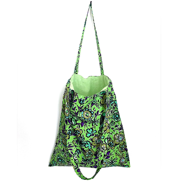 Tote bag en textile motif floral vert et violet doublé en toile de coton couleur vert clair.