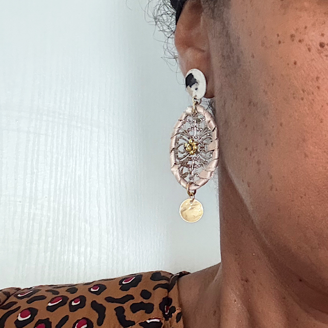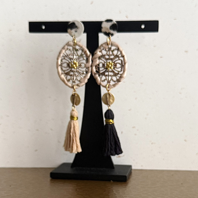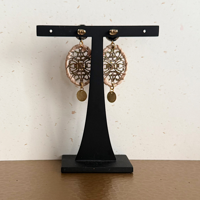 Boucles d’oreilles dentelle en laiton doré et ruban de satin beige.